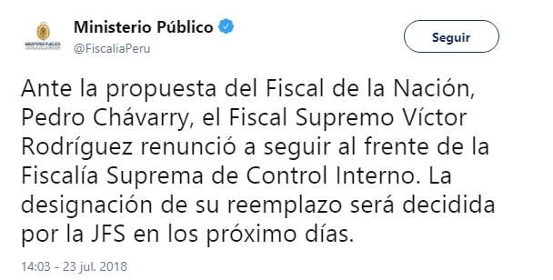 A través de Twitter, el Ministerio Público informó esta tarde que Rodríguez tomó esta decisión “ante la propuesta del Fiscal de la Nación, Pedro Chávarry”, quien juramentó al cargo en reemplazo de Pablo Sánchez y en medio de la polémica por una grabación en la que conversa con el cuestionado juez César Hinostroza.