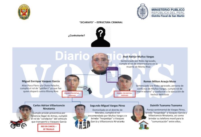 En el nivel de ejecución material, la fiscalía sindica a Miguel Enrique Vásquez García, alias “Poco Floro” o “Chato Pelacho”, como el gatillero que disparó contra la víctima, mientras que Carlos Adrián Villavicencio Ninatanta habría sido el conductor de la motocicleta utilizada para la fuga. Vásquez García habría recibido un revólver calibre .38 especial de Segundo Miguel Vargas Pérez, integrante del nivel logístico, quien, junto con su pareja Dainith Tuanama Tuanama, albergó a los sicarios en una vivienda del distrito de Morales.