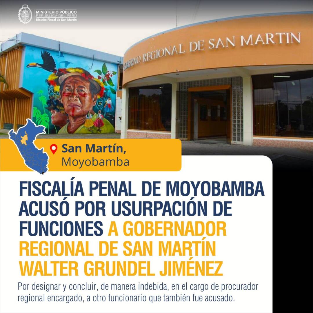El fiscal adjunto provincial del cuarto despacho de la Segunda Fiscalía Penal Corporativa de Moyobamba, Alexander López Gómez, formuló acusación contra el gobernador regional de San Martín, Walter Grundel Jiménez, y el funcionario Juan Efraín Sánchez La Rosa, quienes habrían cometido el delito de usurpación de funciones, en agravio del Estado.