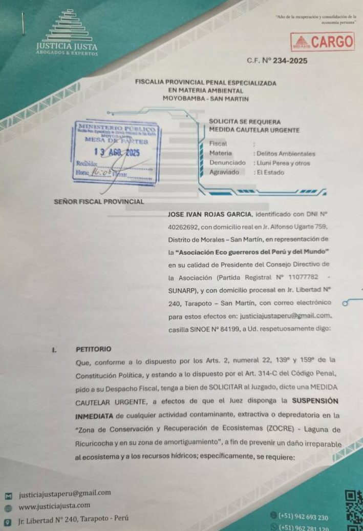 Un nuevo capítulo en la defensa ambiental de la región San Martín se abrió con la presentación de un recurso legal ante la Fiscalía Provincial Penal Especializada en Materia Ambiental de Moyobamba, que busca frenar de manera inmediata las actividades que ponen en riesgo la Zona de Conservación y Recuperación de Ecosistemas (ZOCRE) de la Laguna de Ricuricocha y su área de amortiguamiento.