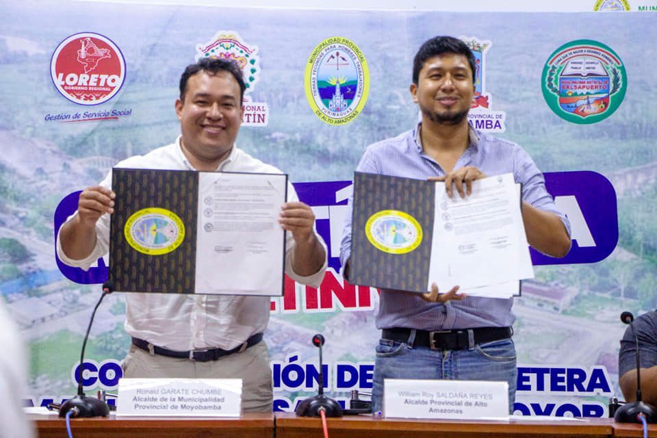 Los alcaldes de Alto Amazonas, Roy Saldaña, y de Moyobamba, Ronald Gárate suscribieron un importante convenio de cooperación interinstitucional con la finalidad de establecer compromisos financieros para los estudios de pre-inversión a nivel de perfil de la futura carretera Yurimaguas, Balsapuerto, Moyobamba.