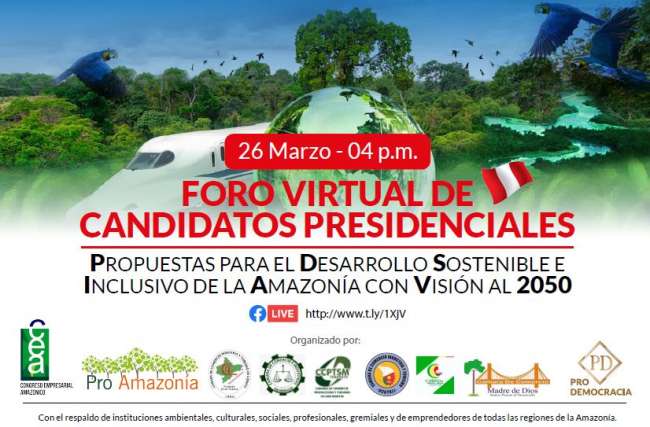 Las Cámaras de Comercio de las regiones amazónicas, conjuntamente con el CEA – Congreso Empresarial Amazónico, Pro Amazonía y el instituto de gobierno & desarrollo sostenible – pro democracia, han unido esfuerzos para convocar a los seis primeros candidatos de la encuesta IPSOS y organizar el foro virtual de candidatos presidenciales “Propuestas para el desarrollo sostenible e inclusivo de la Amazonía con visión al 2050”