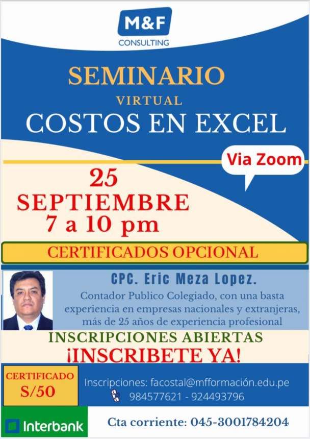 Hoy 25 de septiembre tendremos el Seminario de Costos en Excel, tendrán la oportunidad de aprender a calcular los costó de una empresa, mediante la hoja de cálculo en Excel, poder determinar el Costo Fijo, Costo Variable, desarrollaras tablas dinámicas y podrás realizarlo mediante, un caso práctico, realizarás Kardex, planilla, hoja de producción, depreciación, estado de resultados, punto de equilibrio.