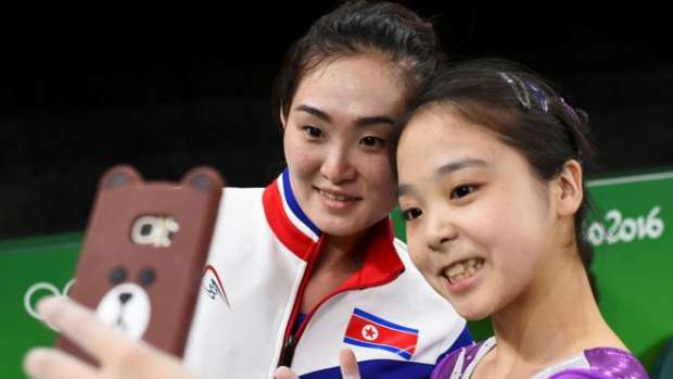 EN LAS OLIMPIADAS LAS GUERRAS NO IMPORTAN. Lee Eun-ju, de Corea del Sur, y Hong Un-jong, de Corea del Norte, se toman un selfie durante un descanso mientras se entrenaban para las competencias de gimnasia. Ambos países están técnicamente en guerra.