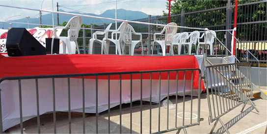 La prensa tarapotina está mortificada por el trato que recibimos cuando visitó el hospital el presidente de la República. Nos hicieron subir a este estrado y una vez ahí nos custodiaron más de 10 policías CON orden para no dejarnos salir ni siquiera al baño. Todo estaba cercado con estas rejas, prácticamente estuvimos retenidos contra nuestra voluntad. Dos reuniones previas para conocer el protocolo por las puras. Esperamos que los gremios periodísticos se pronuncien para que esto no se repita nunca más. FOTO: HUGO ANTEPARRA