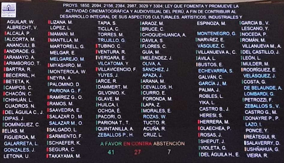 Ley del Cine – Ley de Promoción de la Actividad Cinematográfica y Audiovisual- fue aprobada por el Parlamento, en primera votación, con 46 votos a favor, 27 en contra y 7 abstenciones. busca ampliar, de 2000 a 6000 UIT, los fondos destinados a la actividad cinematográfica en el Perú. El 40% de los recursos serán destinados a promover la industria del cine en las regiones del país.