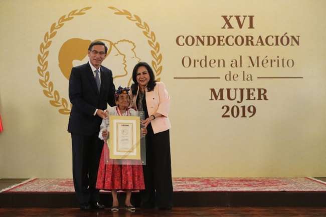 Angela Vela viuda de Gonzales, natural de Lamas, a sus 99 años, recibiendo la condecoración orden al merito de la mujer 2019, por parte del mandatario de la nación Martín Vizcarra. este premio recibió por el ejemplo de vida (adulto mayor)