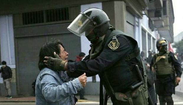 La impactante imagen —que fue difundida por el periodista Beto Ortiz en su cuenta de Facebook y, hasta el momento, ha sido compartida casi 30 mil veces— muestra a un policía consolando a una afligida maestra.