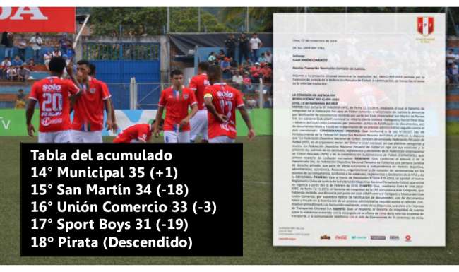 De esta manera, Unión Comercio queda con 33 puntos y baja al décimo sexto lugar de la tabla acumulada. Sport Boys, que es penúltimo, tiene 31 y San Martín suma 34.