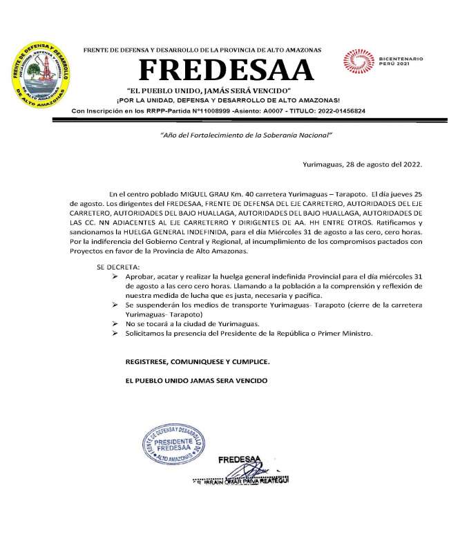 El consejo directivo del Frente de Defensa y Desarrollo de Alto Amazonas (FREDESAA) mediante pronunciamiento público suscrito por ENOC SAAVEDRA PAREDES (Presidente) y DORIS SABAYA SABOTA (Secretaria del Interior) desmiente que se haya decretado el inicio de una huelga indefinida desde el miércoles 31 de agosto en protesta por la no atención del Gobierno.
