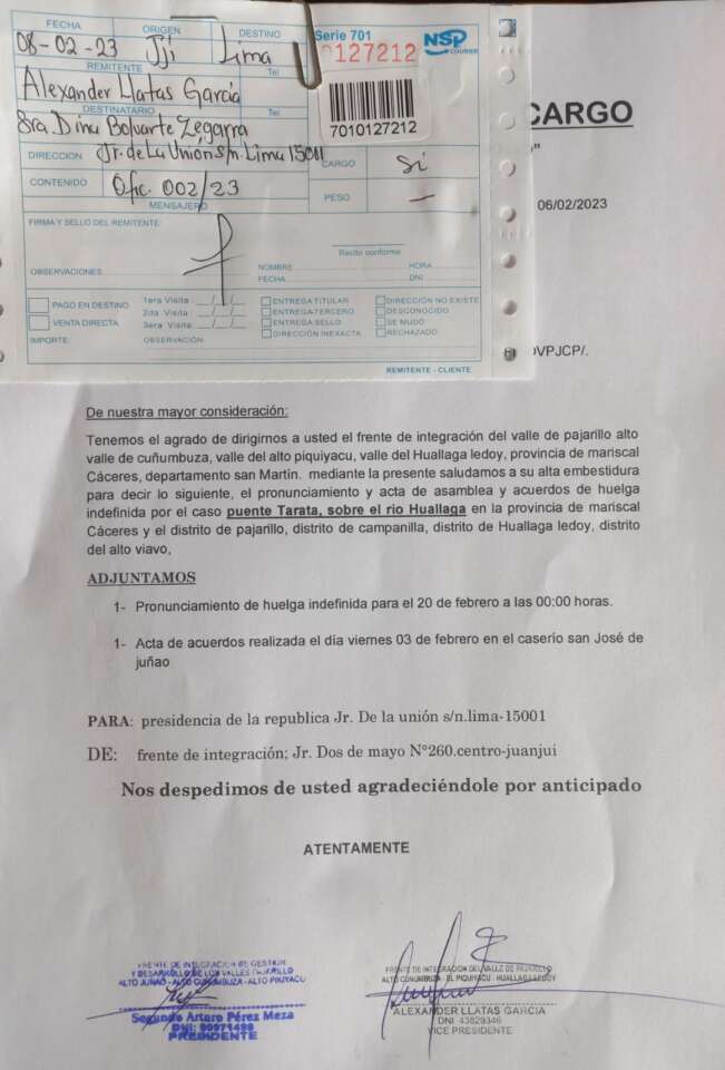 En el memorial lleva la firma de los dirigentes y pobladores del Valle del Pajarillo, Alto Cuñumbuza, Valle el Piquiyacu y del distrito de Juanjuí, en la provincia de Mariscal Cáceres, el acuerdo conjunto que ha sido presentado también al mismo Presidente de Ministro, Luis Otárola, con fecha 8 de febrero 2023.