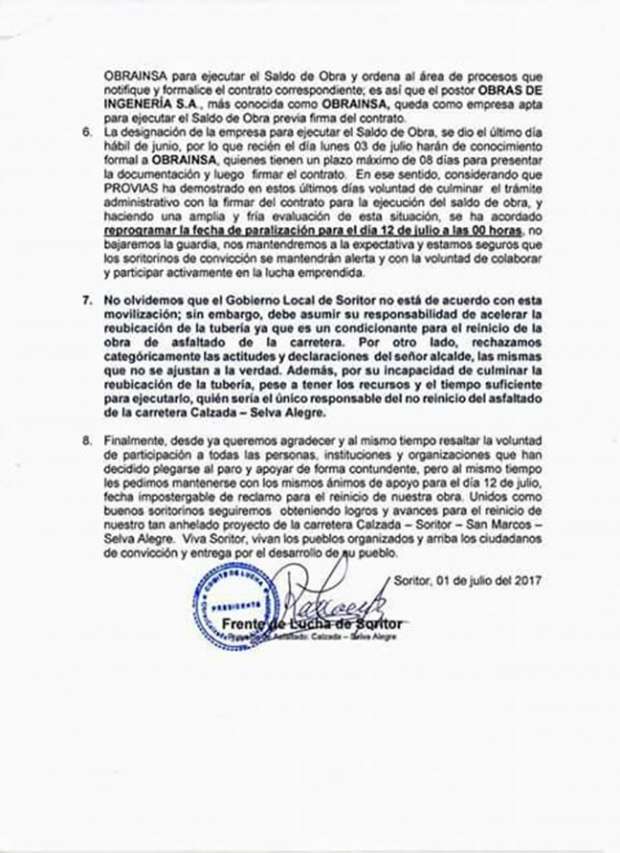 De acuerdo al documento la medida de lucha fue postergada para el próximo miércoles 12 del mes en curso, asegurando que en dicha fecha si o si se realizaría, sin embargo al mismo tiempo se da cuenta que la decisión fue tomada luego de corroborar que las autoridades del Ministerio de Transportes vienen cumpliendo con el cronograma para la ejecución del saldo de la obra con un presupuesto superior a los 67 millones de soles, encontrándose a puertas de la suscripción del contrato con la empresa ganadora del proceso de licitación.