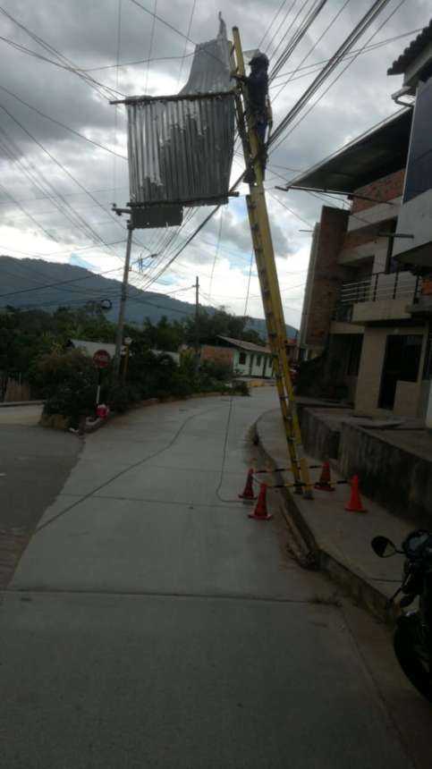 Moyobamba. El fuerte viento registrado al medio de ayer en la ciudad de Moyobamba afectó el techo de una vivienda a la altura de la primera cuadra del jirón Damián Najar, la fuerza del ventarrón elevó por los aires las calaminas de la vivienda que terminaron atrapadas entre los cables de fluido eléctrico. El acontecimiento puso en zozobra a los vecinos, pues temían que pueda generarse un corto circuito. Rápidamente llamaron a los Bomberos, sin embargo, por ser responsabilidad de Electro Oriente se pusieron en contacto con esta empresa quienes provistos de los implementos adecuados para este tipo de situaciones lograron desprender las calaminas y devolver la tranquilidad de los moradores. (Franclin Laván)
