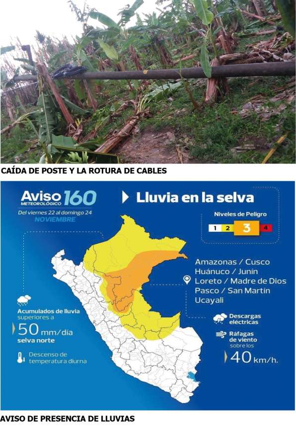 DATO: El Servicio de Meteorología e Hidrología –Senamhi- ha emito un boletín informado que entre el viernes 22 al domingo 24; que en los departamentos de San Martín, Amazonas, Loreto, Ucayali, Cusco y Huánuco se presentarán lluvias, descargas eléctricas y ráfagas de viento sobre los 40 km/h con niveles acumulados de lluvia superiores a 50mm por día.