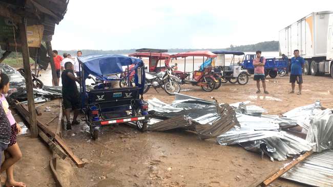 En el puerto informal Boca del Paranapura, el techo de un módulo de servicios higiénicos voló por los aires cayendo 50 metros mas adelante encima de varios vehículos menores entre mototaxis y motos líneas estacionados frente a varios quioscos del lugar.