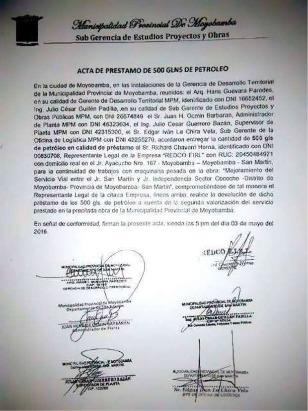 A la letra refiere que “en las instalaciones de la Gerencia de Desarrollo Territorial de la Municipalidad Provincial de Moyobamba, reunidos el Arq. Hans Guevara Paredes, en su calidad de gerente de Desarrollo Territorial (…), el Ing. Julio César Guillen Padilla, en su calidad de Subgerente de Estudios y Proyectos y Obras Pùblicas MPM (…); el Sr. Juan H. Ocmín Barbarán, administrador de planta de la MPM (…), el Sr. Édgar Iván La Chira Vela, sub gerente de la oficina de Logística de la MPM, (…) acordaron entregar la cantidad de 500 galones de combustible en calidad de préstamo al señor Richard Chávarri Horna, representante legal de la empresa REDCO EIRL (…), para la continuidad de los trabajos con maquinaria pesada en la obra: “Mejoramiento del Servicio Vial entre el Jr. San Martín e independencia, Sector Cococho – Distrito de Moyobamba – Provincia de Moyobamba, región San Martín”.