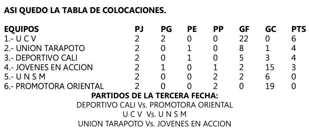 El jueves, luego de dos suspensiones, por fin se jugó la segunda fecha del campeonato de fútbol de Tarapoto, siendo la atracción el denominado clásico Tarapotino cuyos rivales Unión Tarapoto y Deportivo Cali empataron 1 a 1, un choque que creemos satisfizo las expectativas de la regular cantidad de aficionados que se dieron cita a nuestro primer escenario deportivo, el clásico atrae pues la atención del público, de ahí la presencia, pese al día laborable de los aficionados. El encuentro fue arduamente disputado y el 1 a 1 es un resultado justo por lo que hicieron los futbolistas de ambos equipos, sin embargo el equipo unionista tuvo la opción de ganar ya que Sánchez, marró un penal y el popular “Inguiri” Tapullima, en el minuto final desperdició una magnífica oportunidad de anotar, el elenco aguajina con sus conocidos jugadores si bien es cierto tenía en el papel mejores posibilidades, pero a la hora del encuentro sus futbolistas se equivocaron en los pases. El gol unionista fue anotado por intermedio de Jhon Guerrero, previo desvío en un defensor caleño, en tanto que para Cali anotó el empate el jugador Pepe Trauco.