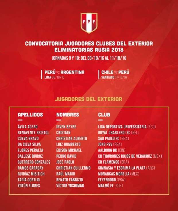El técnico de la selección peruana de fútbol, Ricardo Gareca, convocó a un total de 11 futbolistas que juegan en clubes del extranjero para los partidos contra Argentina (06/10) y Chile (11/10) por las Eliminatorias Rusia 2018.