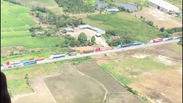 Desde el helicóptero de la comitiva se pudo observar la cantidad de camiones varados en ambos extremos del piquete de los manifestantes quienes tras dialogar con el general Jorge Lan aceptaron dar pase a los vehículos y de esta manera flexibilizaron su medida de fuerza, así manifestó el dirigente Israel Sánchez Altamirano.