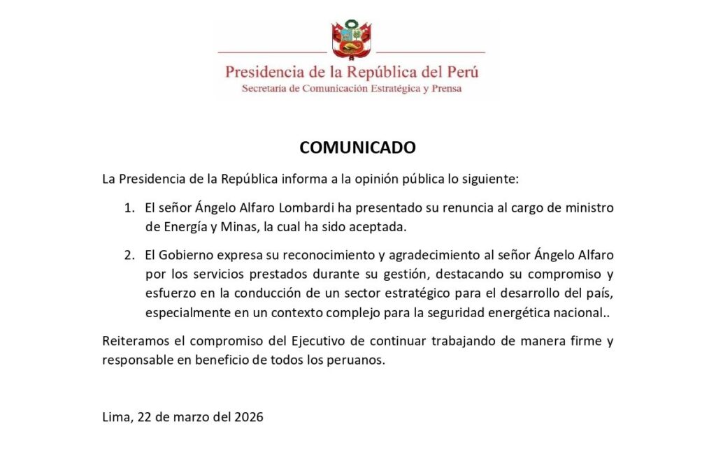 De acuerdo con el pronunciamiento difundido desde Lima el 22 de marzo de 2026, el ahora exministro presentó su dimisión, la cual fue aceptada de inmediato por el Ejecutivo, sin que se detallaran las razones específicas de su salida. La comunicación oficial se limitó a señalar que el Gobierno expresa su reconocimiento y agradecimiento por los servicios prestados durante su gestión, destacando especialmente su “compromiso y esfuerzo en la conducción de un sector estratégico”.