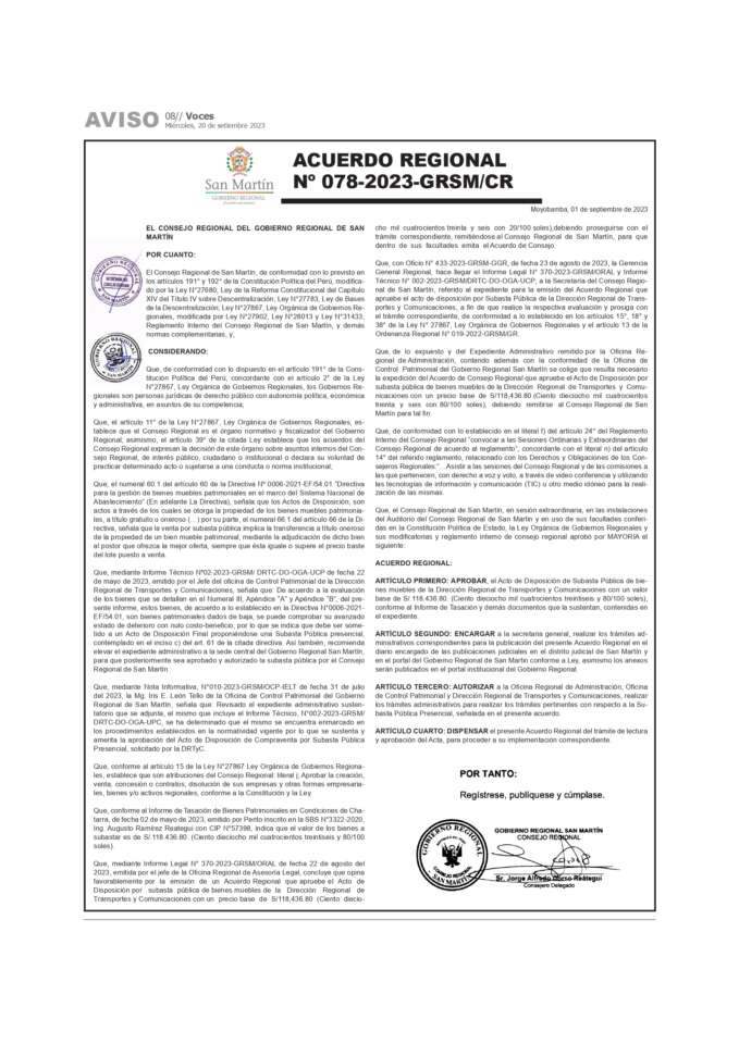 Gobierno Regional de San Martin: Acuerdo Regional N° 078-2023-GRSM/CR