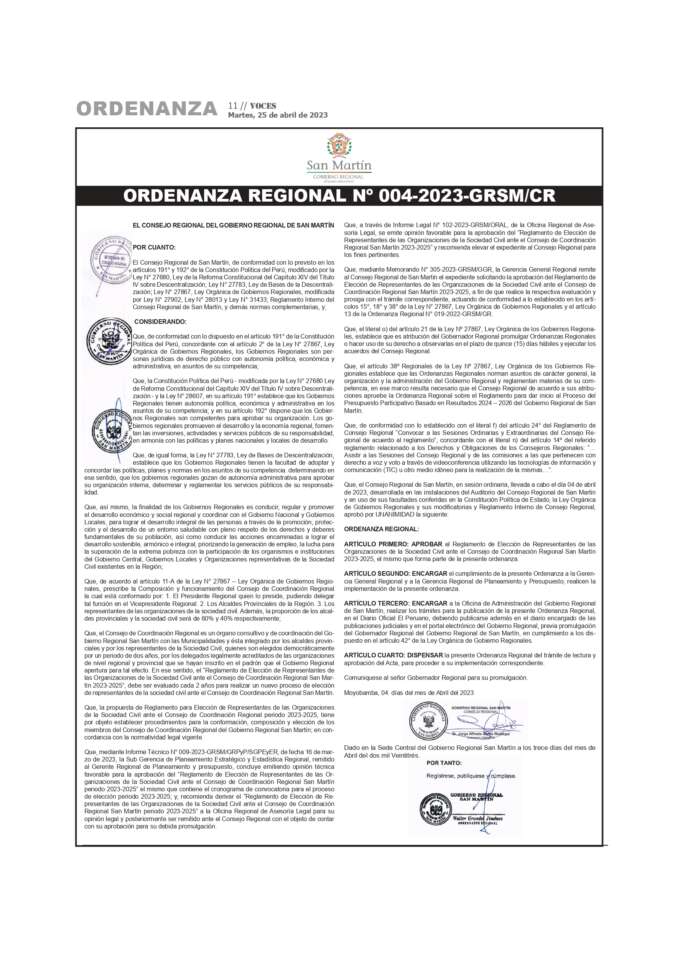 Gobierno Regional de San Martin: Ordenanza Regional N° 004-2023-GRSM/CR