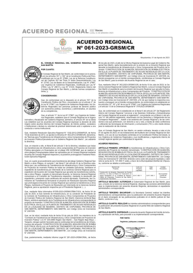 Gobierno Regional de San Martin: Ordenanza Regional N° 011-2023-GRSM/CR, Ordenanza Regional N° 012-2023-GRSM/CR, Acuerdo Regional N° 061-2023-GRSM/CR,