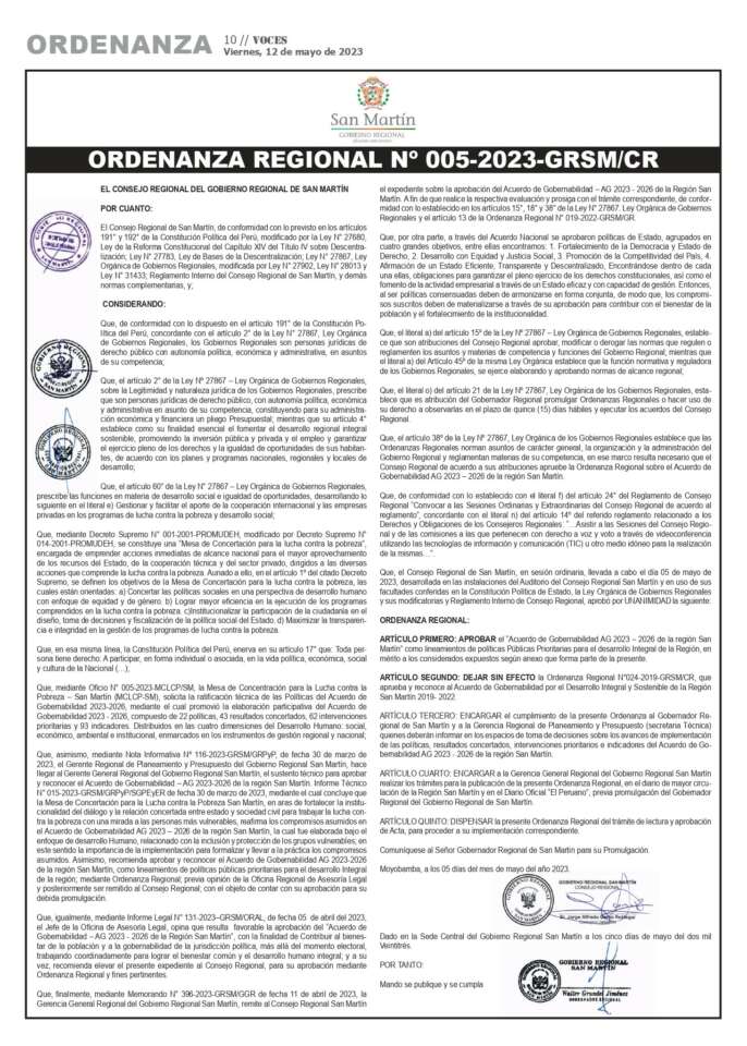 Gobierno Regional San Martin: Ordenanza Regional N° 005-2023-GRSM/CR