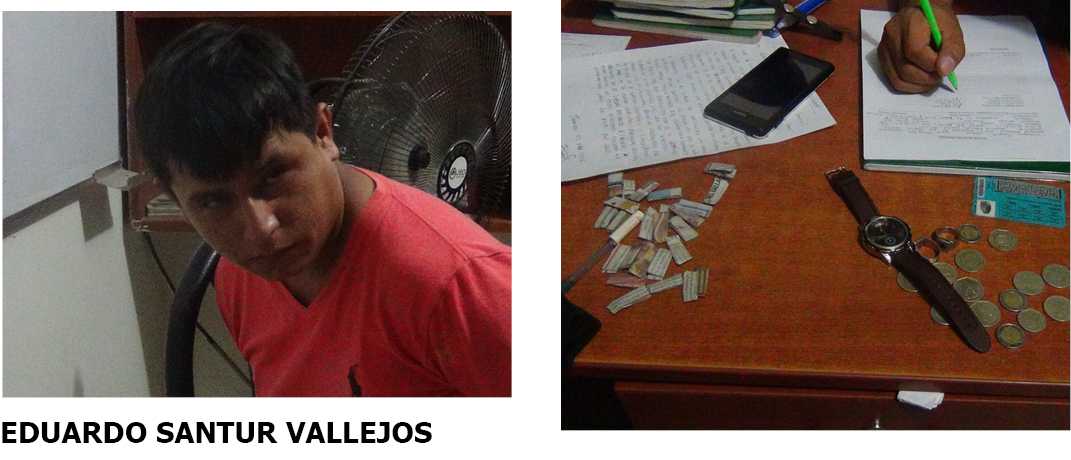La noche del martes, el Escuadrón de Emergencia 105, intervino a Eduardo Santur Vallejos (26), quien se dedicaba a la microcomercialización de ketes de pasta básica de cocaína PBC, en la parte baja del distrito de Morales.