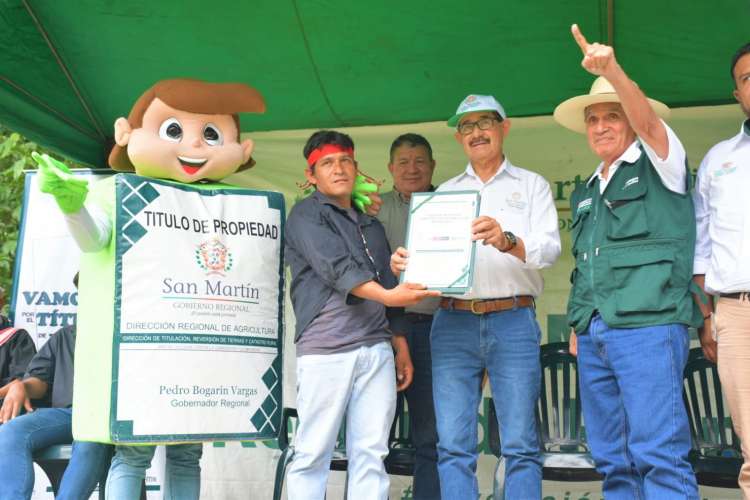 El gobernador regional de San Martín, Pedro Bogarín Vargas, junto al director ejecutivo de la Unidad Ejecutora de Gestión de Proyectos Sectoriales – UEGPS adscrita al viceministerio de Desarrollo e Infraestructura Agraria y Riego del Minagri Carlos Cueva Palacios entregó el título de propiedad a la comunidad nativa Ampi Sacha – Mishquiyacu, ubicada en la jurisdicción del distrito de San José de Sisa, provincia de El Dorado.