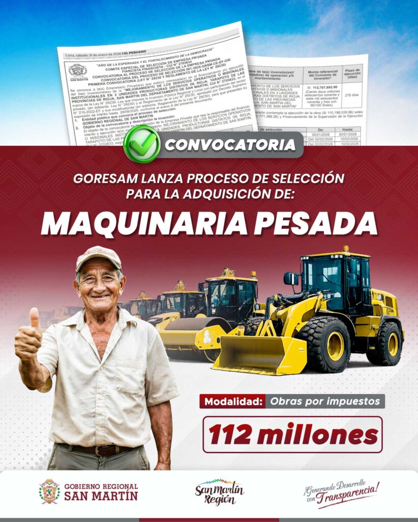 En el tramo final de la actual administración, el Gobierno Regional de San Martín (GORESAM), a través de la Oficina de Promoción de Inversión Privada Sostenible, viene impulsando una ambiciosa cartera de proyectos bajo el mecanismo de Obras por Impuestos, con una proyección que alcanza los S/ 921,194,472.73, según el documento oficial de cartera 2026.