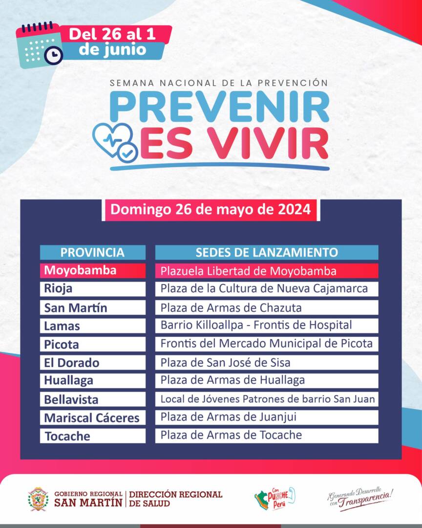 El lanzamiento regional será este domingo 26 de mayo a partir de las 9 a. m en la Plazuela Libertad de la provincia de Moyobamba, por lo que, se convoca a la ciudadanía participar de esta campaña, una gran oportunidad para realizarse un chequeo preventivo.