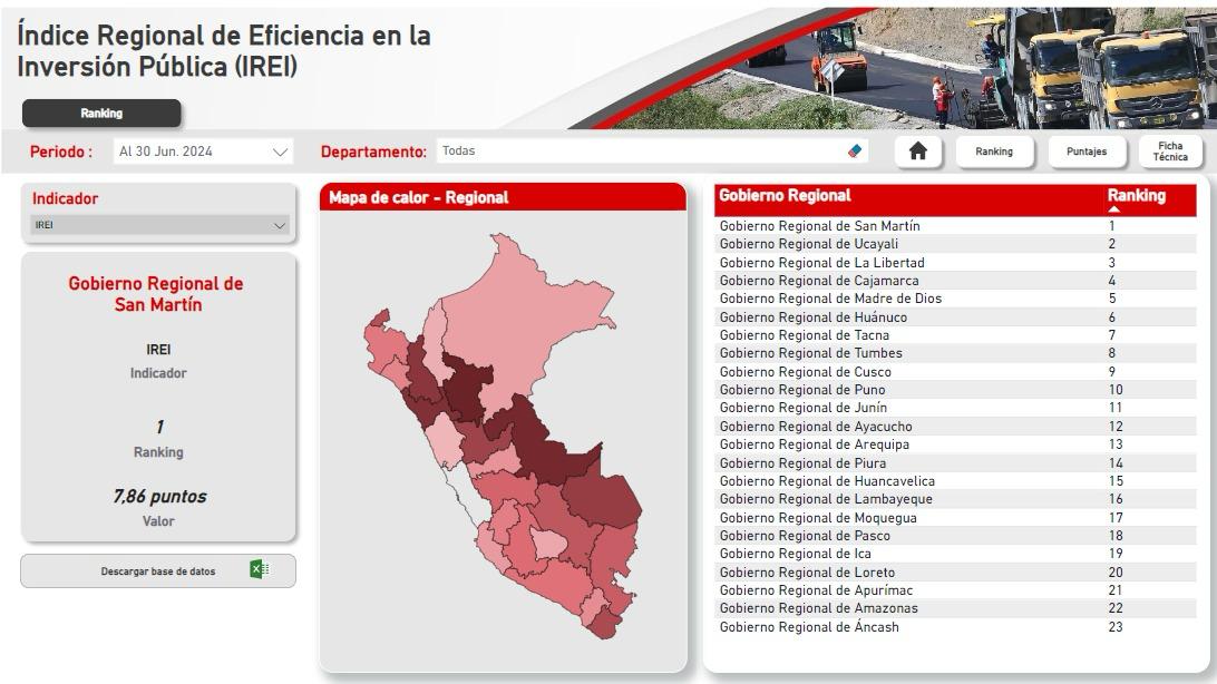 Al primer semestre del 2024, el Gobierno Regional de San Martín (Goresam) se ubica en el primer lugar a nivel nacional en el ranking “Índice Regional de Eficiencia en la Inversión Pública” (IREI), según la evaluación integral realizada a los gobiernos regionales de todo el país.