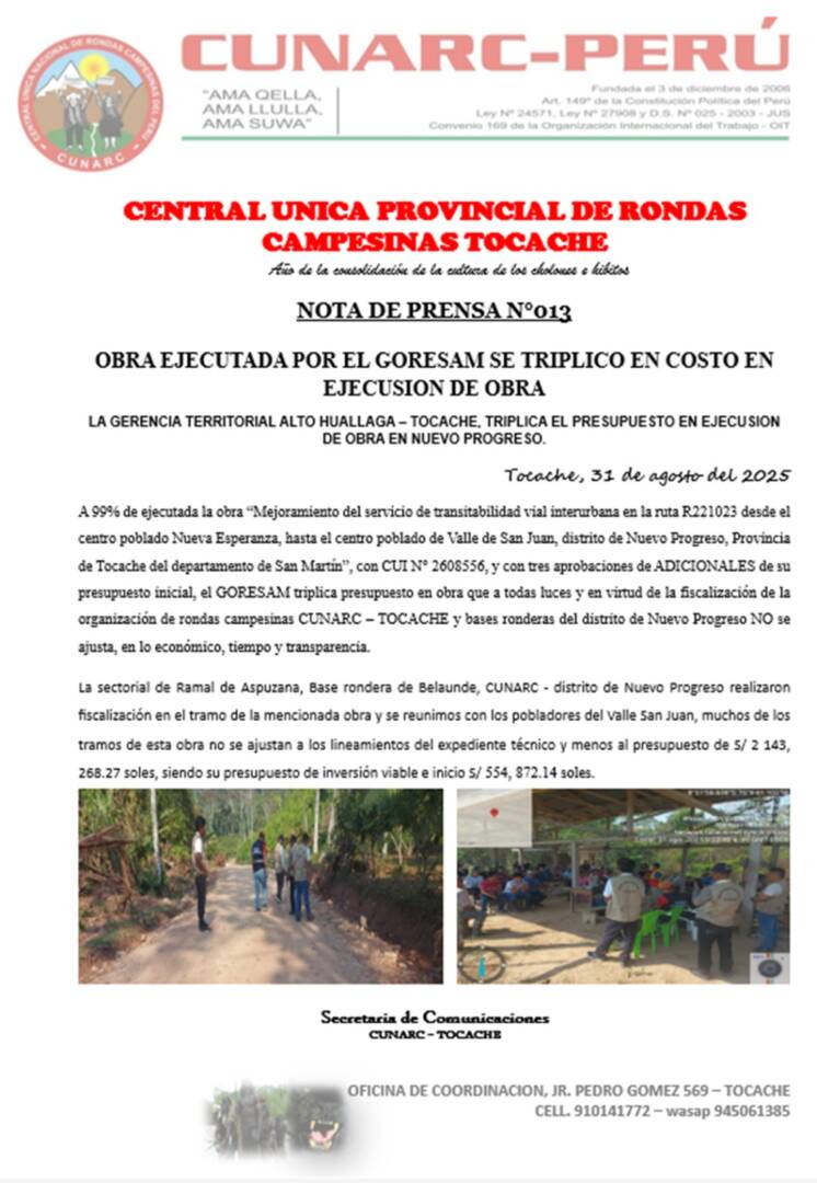La Central Única Provincial de Rondas Campesinas de Tocache (CUNARC – TOCACHE) denunció que el Gobierno Regional de San Martín a través de la Gerencia Territorial Alto Huallaga – Tocache, ha triplicado el presupuesto en la ejecución de la obra “Mejoramiento del servicio de transitabilidad vial interurbana en la ruta R221023 desde el centro poblado Nueva Esperanza hasta el centro poblado Valle de San Juan, distrito de Nuevo Progreso, provincia de Tocache”.