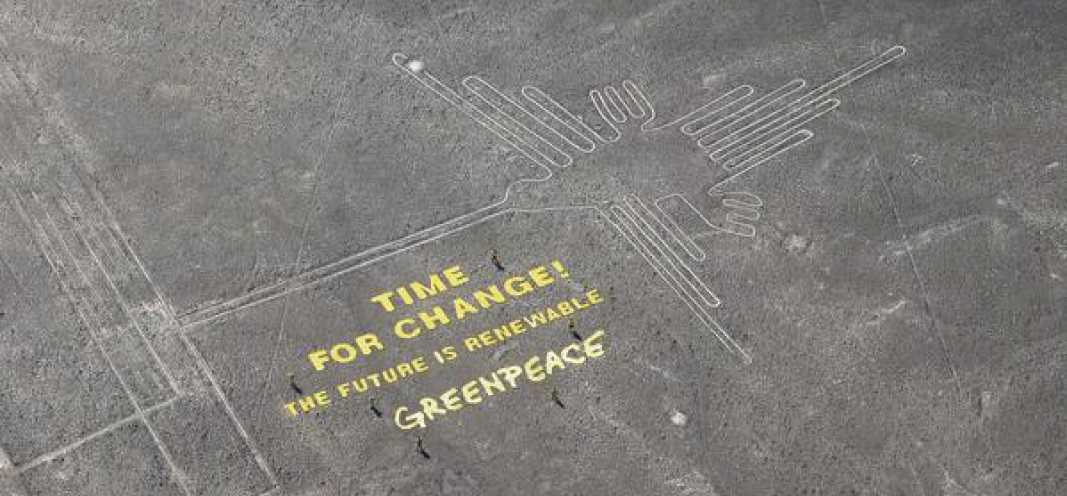 Un grupo de activistas de la ONG ambientalista Greenpeace realizó esta madrugada una protesta en el espacio arqueológico correspondiente a las Líneas de Nasca, en Ica, considerado Patrimonio Cultural de la Humanidad.