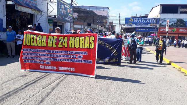 Gremios sindicales de las entidades públicas marcharon ayer por las principales calles de Tarapoto, como parte de las medidas de fuerza del paro de 24 horas convocado por la Confederación General de Trabajadores del Perú (CGTP). Durante la movilización no se produjo mayores inconvenientes y las delegaciones junto a sus dirigentes estuvieron presentes a la hora indicada.