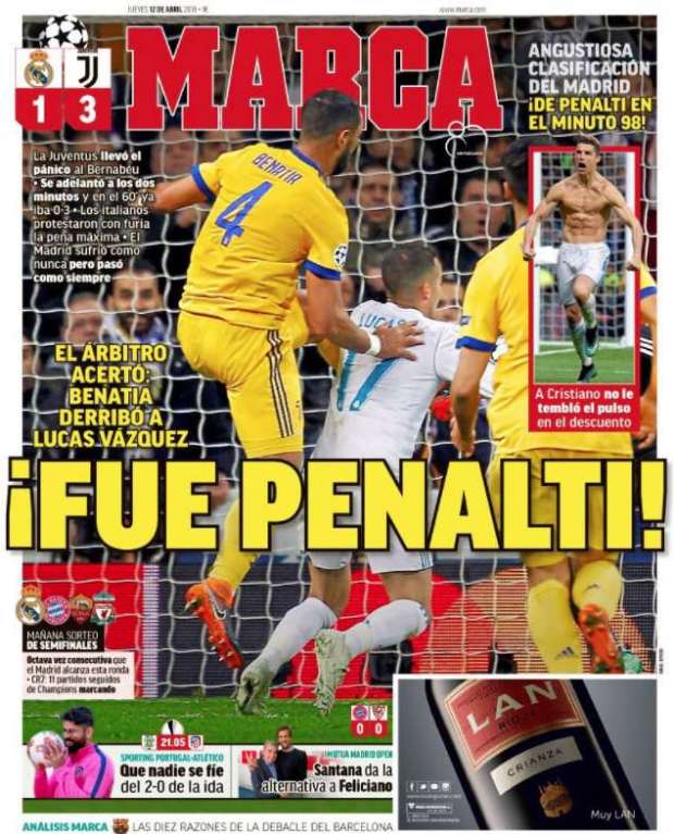 Luego del polémico penal que le dieron al Real Madrid en el final del partido con la Juventus, y que Cristiano Ronaldo cambió por gol y clasificación, se vio reflejado en los dos diarios con sus respectivas opiniones.