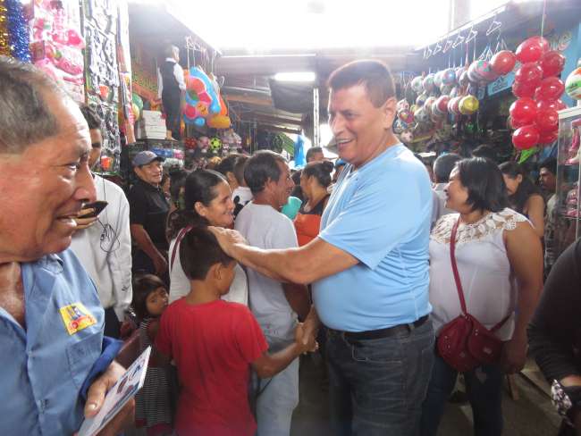 Tocache. Wálter Grúndel candidato regional de la “A” en contacto con los comerciantes del mercado general de Tocache, prometió mejorar las condiciones del sistema de agua y desagüe que por ahora es precario en la ciudad de Tocache a pesar que hubo presupuesto para su construcción todo quedo a medias.