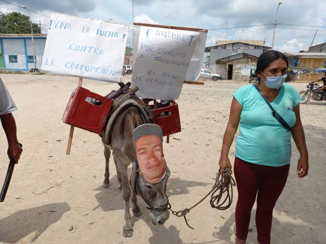 Los manifestantes llevan más de tres semanas exigiendo la salida de Gonzáles Lozada, prepararon la acémila con dos carteles, le colocaron cajas de cerveza y una foto con el rostro de la autoridad, sin embargo, al no haber encontrado a Gonzáles Lozada en su oficina realizaron una marcha por las diferentes calles de la localidad.