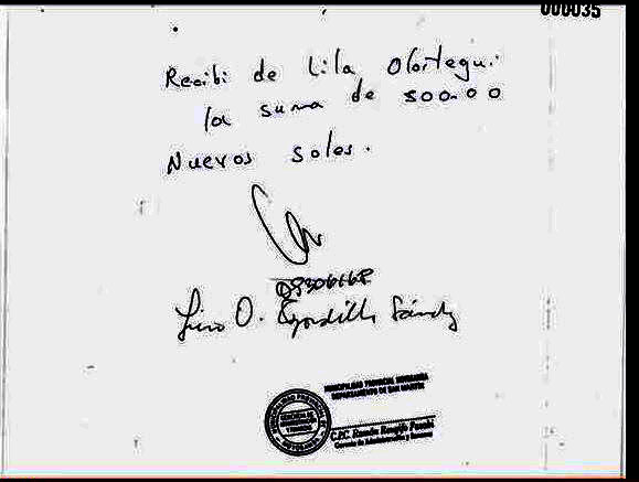 Asimismo, encontró un recibo simple donde al comunicador social Lino Gordillo Sánchez quien desde hace aproximadamente un mes se encuentra en la clandestinidad, sin embargo aparece que recibió de manos de la responsable de caja chica Lila Olórtegui también la suma de 500 soles, pero en este recibo curiosamente no aparece la firma del gerente de Administración C.P.C Ramón Rengifo Fasabi, como sí se consigna en otros documentos de esta modalidad.