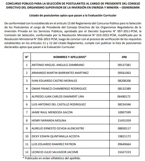 La Comisión de Selección que se encargará de la conducción del Concurso Público para el cargo de presidente del Consejo Directivo de los Organismos Reguladores, publicó una lista de 12 postulantes aptos para el cargo de presidente de Osinergmin (Organismo Supervisor de las Inversiones en Energía y Minería).