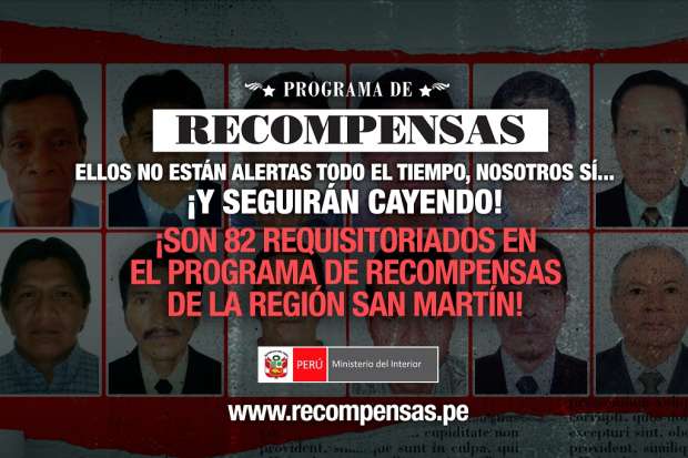 La Policía Nacional está tras los pasos de 82 personas requisitoriadas en San Martín incluidas en el Programa de Recompensas “Que ellos se cuiden” promovida por el Ministerio del Interior (Mininter) denunciados por cometer delitos en la región. Por información que conlleve a sus capturas, el Estado ofrece entre S/. 5 000 y S/. 20 000.