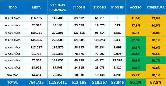 Como primera dosis 612. 189 segunda dosis 518.367 y con tercera dosis 58.846, teniendo un indicador de cobertura 67,8% e indicador de acceso 80,1%