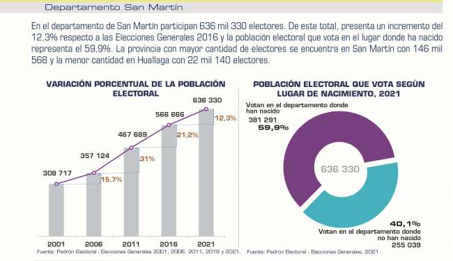Datos oficiales de la RENIEC nos señalan que, de un total de la población electoral del departamento de San Martín, las mujeres representan el 47,6% y los hombres el 52,4%. La población con mayor participación comprende a los jóvenes de 25 a 29 años de edad; mientras que los electores que deben de votar de manera obligatoria representan el 93,2%. A la fecha de las elecciones, la población electoral de 18 años de edad representa el 2,5% y los que tienen DNI caducados es del 11,3%.