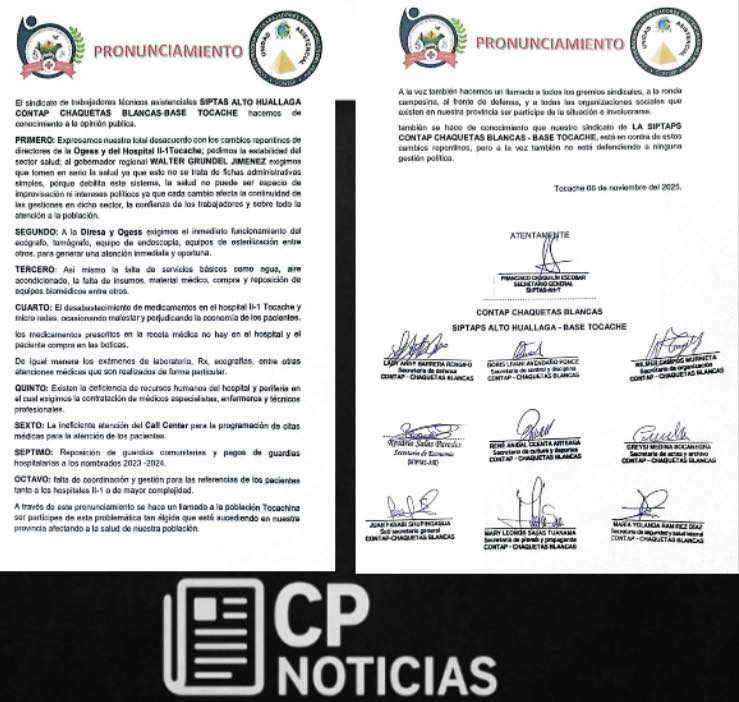 El Sindicato de Trabajadores Profesionales Técnicos Asistenciales SIPTAS Alto Huallaga – Contap Chaquetas Blancas, base Tocache, emitió un pronunciamiento a la opinión pública señalando que esta carencia ha generado graves afectaciones al funcionamiento normal del hospital, comprometiendo las condiciones básicas necesarias para la prestación de servicios de salud en la ciudad.