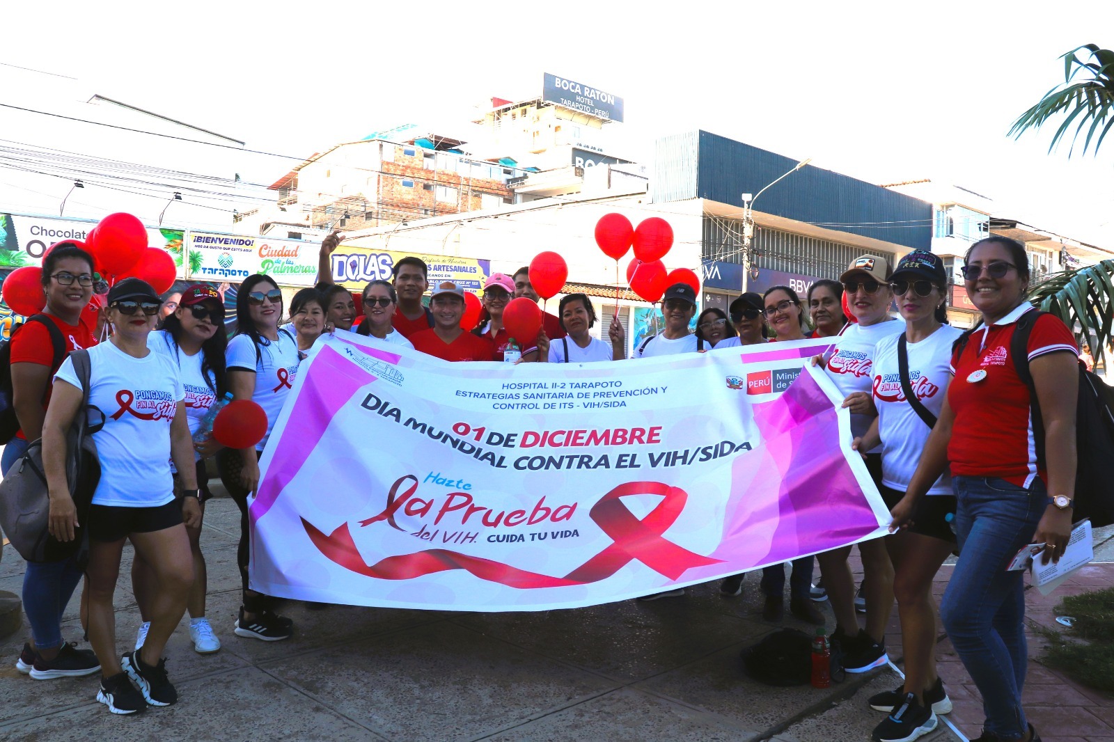 Del mismo modo, se llevó a cabo un pasacalle por el centro de la ciudad de Tarapoto, donde también participaron otras instituciones, con cartelones alusivos a la fecha, repartiendo volantes con información preventiva de la enfermedad y obsequiando profilácticos a la población; finalmente culminó la actividad con un bailetón con la participación activa de los asistentes.