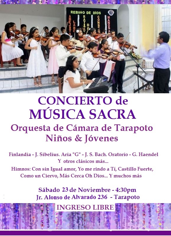 Por quinto año consecutivo, niños y jóvenes que estudian música bajo la dirección del maestro Karl Lombardi, ofrecerán un concierto de Música Sacra. Este evento cultural se realizará este sábado 23 de noviembre a 4:30pm en el auditorio de Jr. Alonso de Alvarado 236 Tarapoto.