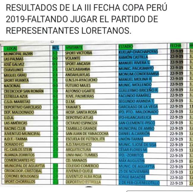 *** Faltando el partido entre loretanos que hoy debe jugarse a partir de las 8.00 p.m. nuestros equipos sanmartinenses ocupan el 22 lugar Dorado FC y el 30 lugar el AD Tahuishco, lo que si sorprende amigos es el triunfo del Municipal de Jazán por 3 a 2 ante el subcampeón amazonense Sport Victoria, también nos “alegra” la derrota del Llacuabamba ante el campeón liberteño Chavelines por 2 a 1. Por eso si la primera fase hubiera terminado ayer nuestros dos representantes ya estarían en la según a fase, pero faltan seis puntos que deben ser favorables a los nuestros para de verdad asegurar nuestra continuidad en la nacional.