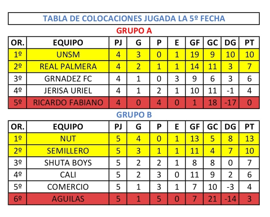 Luego de haberse jugado la maratónica quinta fecha (ultima de la primera rueda) del pasado sábado, los resultados previstos fueron: GRANDES FC 3 – 1 RICARDO FABIANO, SHUTA BOYS 5 – 2 AGUILAS TARAPOTO, DEPORTIVO CALI 3 – 2 UNION COMERCIO, JERISA URIEL 3 – 5 REAL PALMERA y NUEVO UNION TARAPOTO FC 2 – 1 SEMILLERO TARAPOTO, así quedó la tabla de colocaciones: