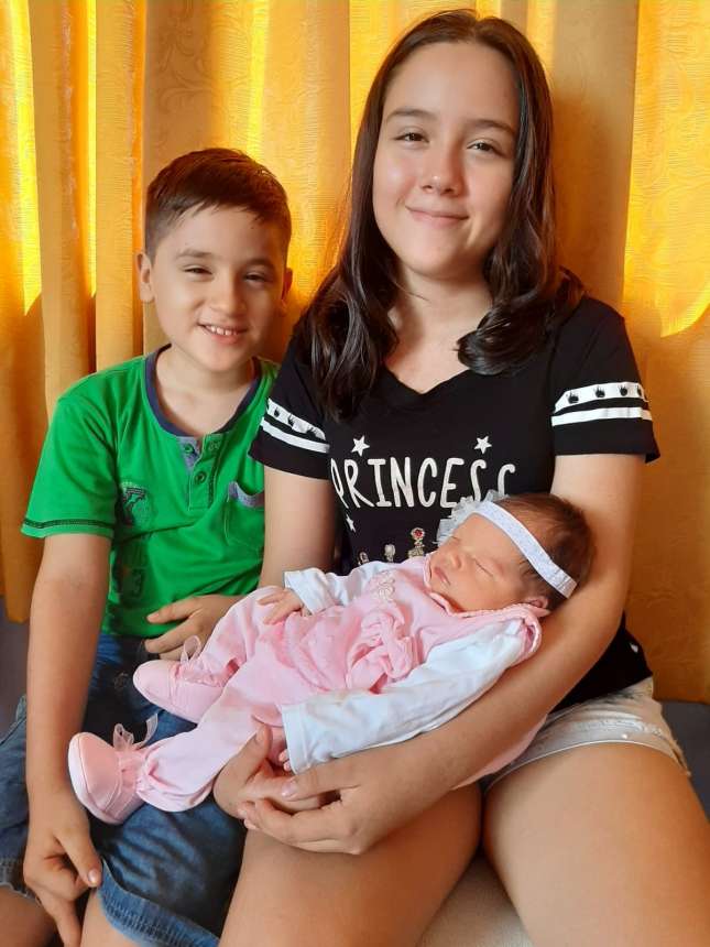 Texto de Imagen: Sandro del Piero junto a su hermana Melissa Jazmín del Pilar, dando la bienvenida a su hogar a la hermanita Gia Maciel Torres Olano. Felicitaciones y vamos por la “Ishpa”.